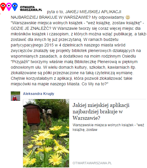 Na portalu Otwarta Warszawa padło pytanie o to, JAKIEJ MIEJSKIEJ APLIKACJI NAJBARDZIEJ BRAKUJE W WARSZAWIE? My odpowiedzieliśmyEmotikon smile Appka wskazująca lokalizacje miejsc wymiany książek - takich, jakim będzie nasza osiedlowa Biblioteczka Plenerowa!